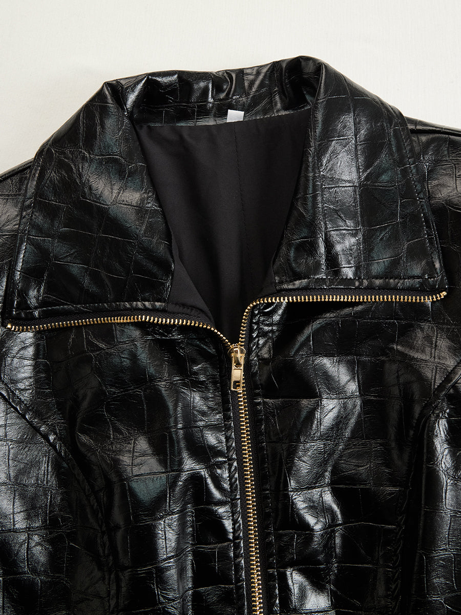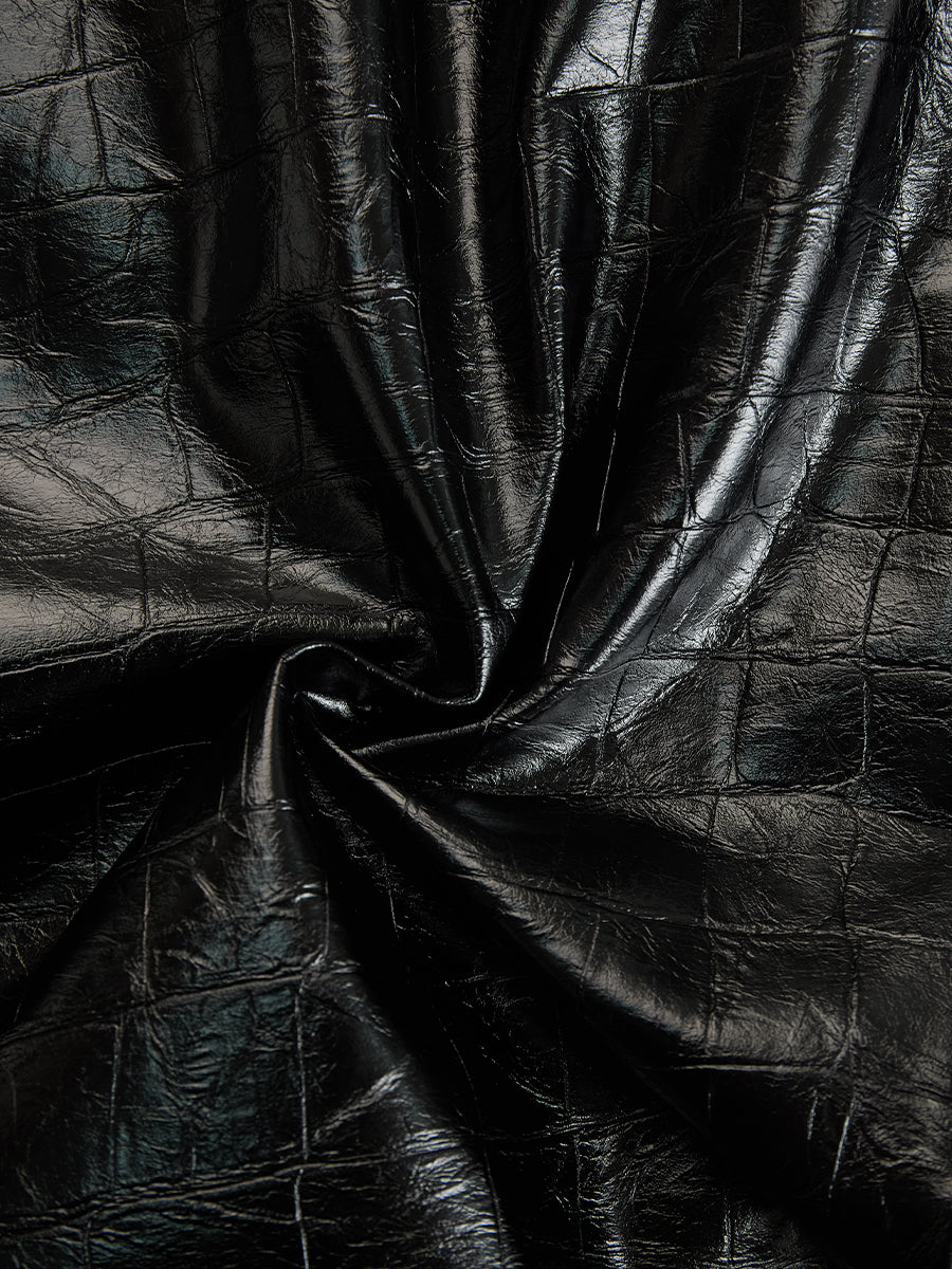 This sleek croc-effect faux leather dress radiates modern glamour with its high-shine finish and sculpted silhouette. Designed with a full-length front zipper, the piece allows versatile styling, from a daring deep neckline to a more modest zip-up closure.