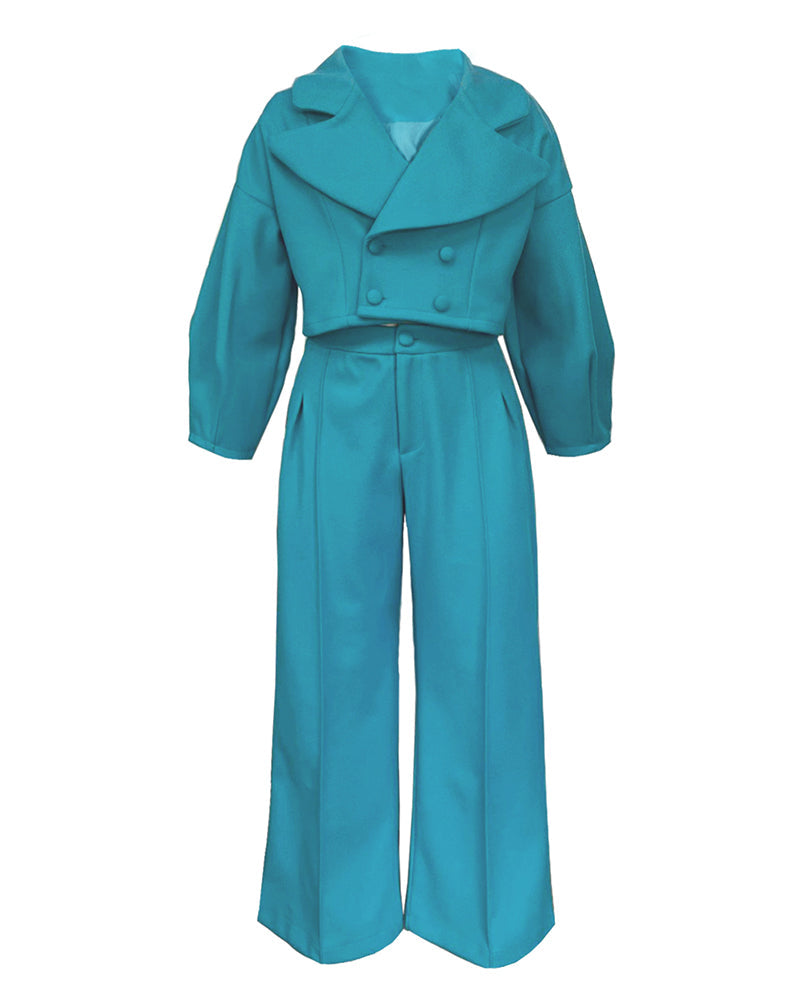 • Top: Lapel collar, lantern sleeves, drop shoulder, double breasted button closure
