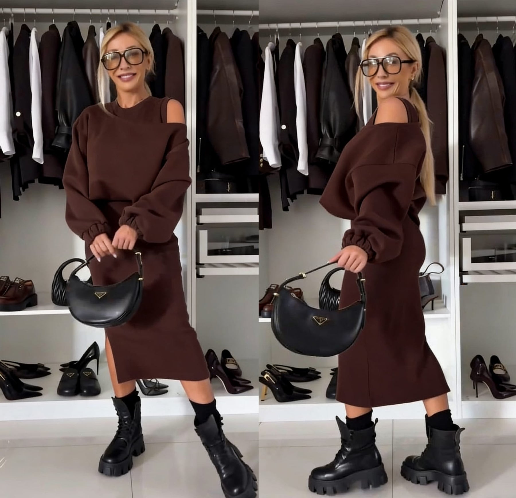 This elegant two-piece set blends comfort with refined, modern style. Featuring a softly draped top paired with a perfectly fitted midi dress, it creates an effortlessly polished look.